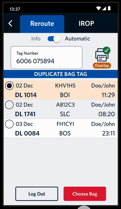 The Reroute application has an accompanying mobile application used to scan bag tags, view their status and routing, initiate reroutes, and print new tags. This application poses special challenges in terms of accessibility and simplicity.